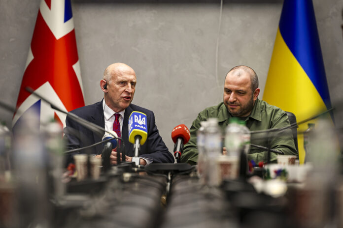 英國國防大臣希利(左)7日訪問烏克蘭敖德薩,與烏克蘭國防部長烏梅洛夫(右)會談並舉行記者會。(英國國防部提供) (圖:中央社)
