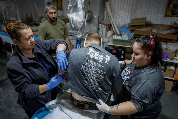 圖為1日在俄羅斯對烏克蘭的攻擊中,醫務人員在烏克蘭 Donetsk 地區 Chasiv Yar 鎮附近的醫療穩定點內,準備運送一名受傷的烏克蘭軍人。(路透社/達志影像)
