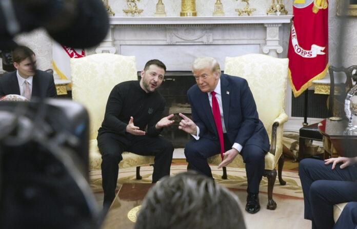 烏克蘭總統澤倫斯基(Volodymyr Zelenskyy,左)2月28日在白宮與美國總統川普(Donald Trump,右)會面。(美聯社/達志影像)