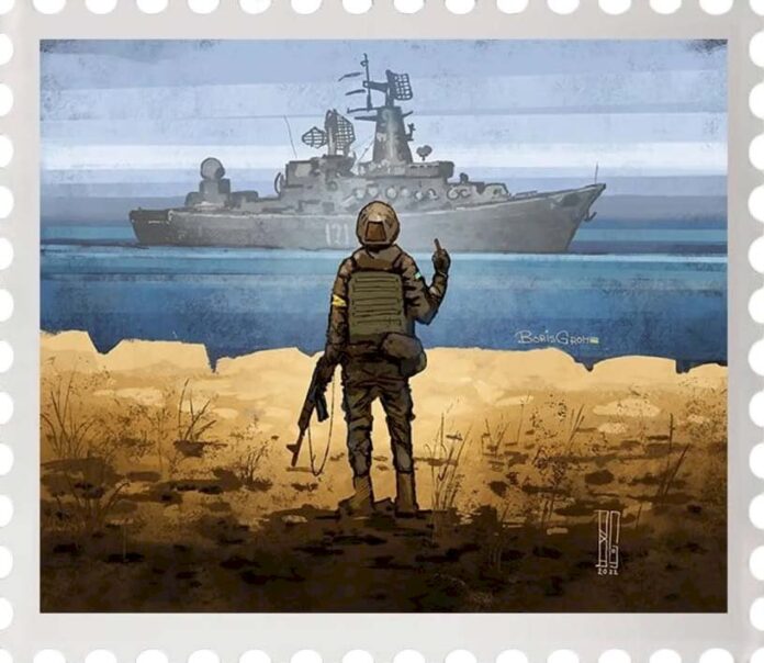 由藝術家Boris Groh所繪的烏克蘭蛇島士兵對俄羅斯船艦比中指的插畫,獲選為烏克蘭郵政發行對抗俄羅斯紀念郵票圖樣。(Twitter)