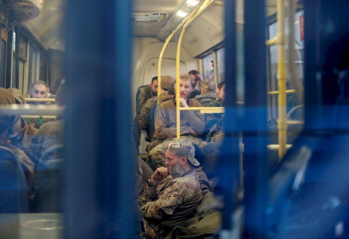 馬立波(Mariupol)亞速鋼鐵廠(Azovstal)的超過250名烏克蘭戰士搭乘多輛汽車前往俄控制的新亞速斯克地區。(路透社/達志影像)